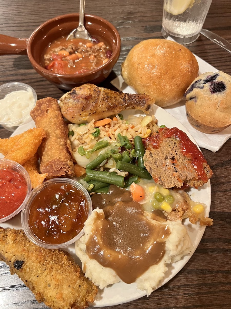 The atmosphere carries a gentle nostalgia, inviting guests to take their time among the wooden accents and well-worn booths, reminiscent of a beloved local cafeteria. Here, friends and families gather around tables abundant with choices—meals that thoughtfully balance classic favorites with homestyle touches. Whether it’s the early morning welcome of fresh fruit, warm pastries, and an omelet bar, or the midday and evening spread boasting carved roast, crispy fried chicken, and comforting sides, the buffet encourages a sense of plenty without rush.